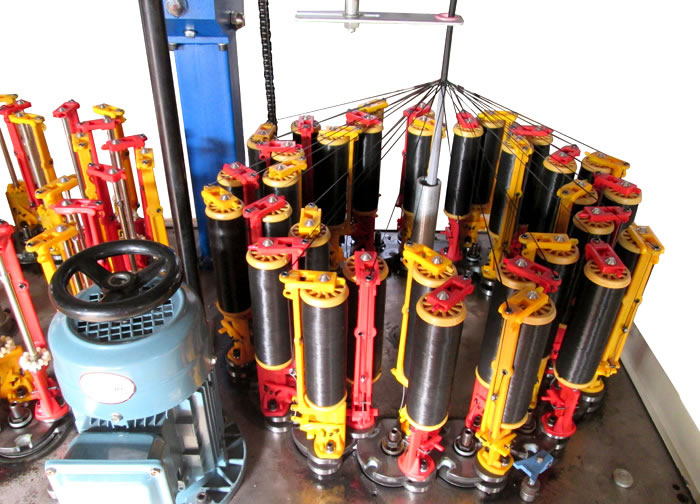 我公司生產的90系列編織機被廣泛的用于編織各種圓或者扁的繩帶(鞋帶、手提帶、拖車繩、行李繩、釣魚線、裝飾繩、高空強力繩、松緊帶等)和電線電纜(高溫導線、屏蔽線、布花線等),高壓膠管(氧氣、乙炔管、高壓油管、噴霧管等),復合材料骨架編織(碳纖維、玻璃纖維),小型盤根,汽車線束。