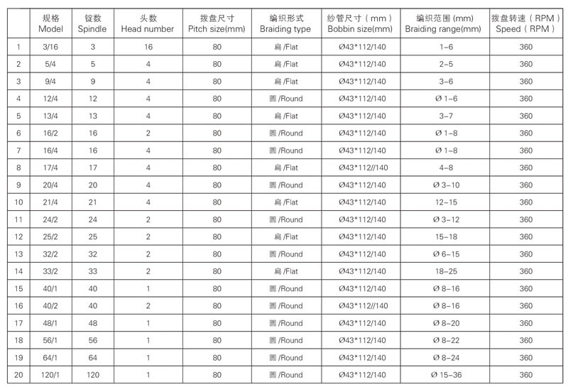 我公司生產的 80 系列高速編織機被廣泛的用于編織各種圓的或者扁的繩帶(鞋帶、手提帶、拖車繩、行李繩、釣魚線、玻纖管、高壓膠管、裝飾繩、松緊帶等)和電線電纜(高溫導線、屏蔽線等)。