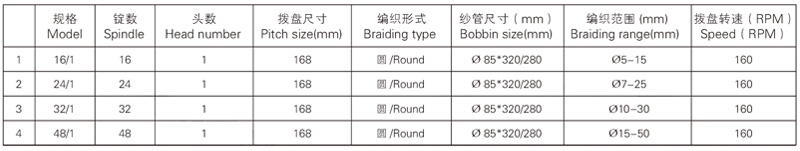 該系列編織機主要用于各種大規格繩纜(如船用纜繩,鐵路用篷布繩,消防用繩,拖車繩,引紙繩,皮繩等)、大規格導電帶、高壓膠管、圓型盤根等。