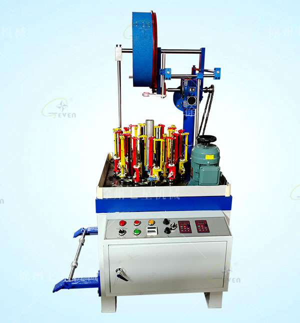橄欖魚線編織機,電控箱用加長電控箱,編織橄欖型線繩,橄欖規格10mm,12mm,14mm,16mm。放線盤尺寸直徑330,寬度25,內孔3.6cm,收線架適用Φ200mm。平滾筒、雙壓輥牽引、后帶落線架。掛輪機配一套。90彈錠,紗管尺寸47*142。收線架,配筒體直徑200,寬度250,外直徑500mm活動線盤。裝12個芯線傘桿,傘桿下裝2套夾線器,及斷線感應裝置,雙變頻,帶減速機。帶感應開關,計米器,芯線撐線圈直徑150mm,材質不銹鋼,收排線架樣式按照魚線收線架做,周長約1-1.2米。